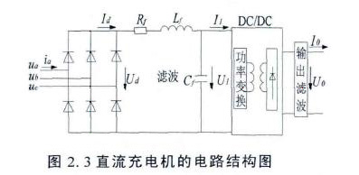 直流充電樁電氣系統(tǒng)三相電網(wǎng)輸入交流電,經(jīng)過三相橋式不可控整流電路整流變成直流電,濾波后提供給高頻DC-DC功率變換器,功率變換器經(jīng)過直直變換輸出需要的直流,再次濾波后為純電動(dòng)汽車動(dòng)力蓄電池充電。