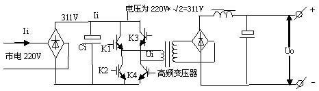 由電路可以看出,市電經(jīng)整流濾波后變?yōu)?11V高壓,經(jīng)K1~K4功率開關(guān)管有序工作后,變?yōu)槊}沖信號(hào)加至高頻變壓器的初級(jí),脈沖的高度始終為311V。當(dāng)K1,K4開通時(shí),311V高壓電流經(jīng)K1正向流入主變壓器初級(jí),經(jīng)K4流出,在變壓器初級(jí)形成一個(gè)正向脈沖,同理,當(dāng)K2,K3開通時(shí),311V高壓電流經(jīng)K3反向流入主變壓器初級(jí),經(jīng)K2流出,在變壓器初級(jí)形成一個(gè)反向脈沖。這樣,在變壓器次級(jí)就形成一系列正反向脈沖,經(jīng)整流濾波后形成直流電壓。當(dāng)輸出電壓Uo較高時(shí),脈沖寬度就寬,當(dāng)輸出電壓Uo較低時(shí),脈沖寬度就窄,因此開關(guān)管實(shí)際上是一個(gè)控制脈沖寬窄的裝置。